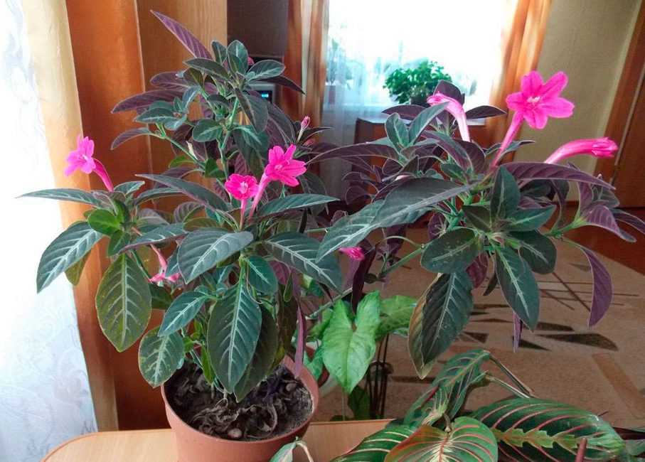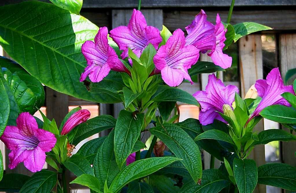 Руэллия Портелла (Ruellia Portellae). Имеет тёмно-зеленые (почти коричневатые) бархатистые листья со светлой (почти белой) прожилкой. С обратной стороны листья красновато-пурпурные. Благодаря этому, отлично смотрится не только во время цветения. Цветки ярко-розового цвета, довольно крупные для Руэллии, располагаются на длинном черешке. Руэллия Портелла — один из популярнейших видов.