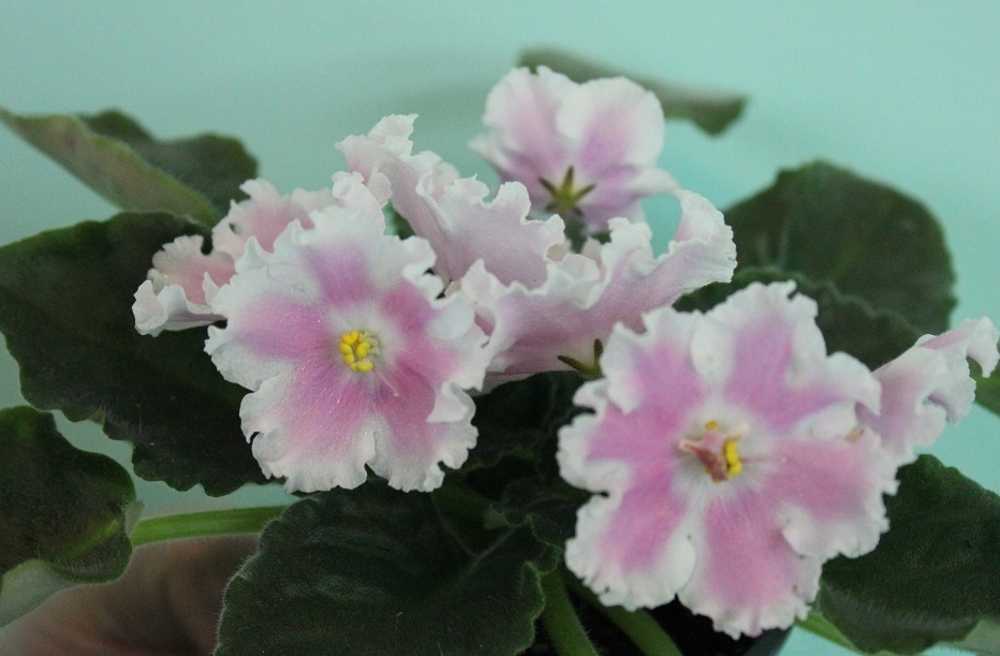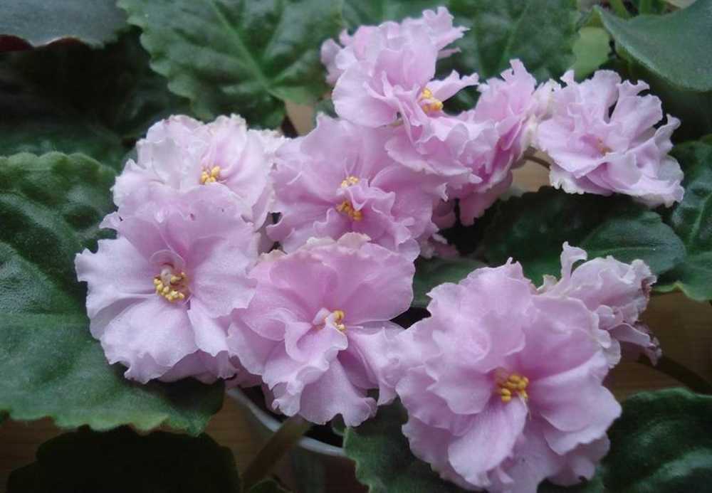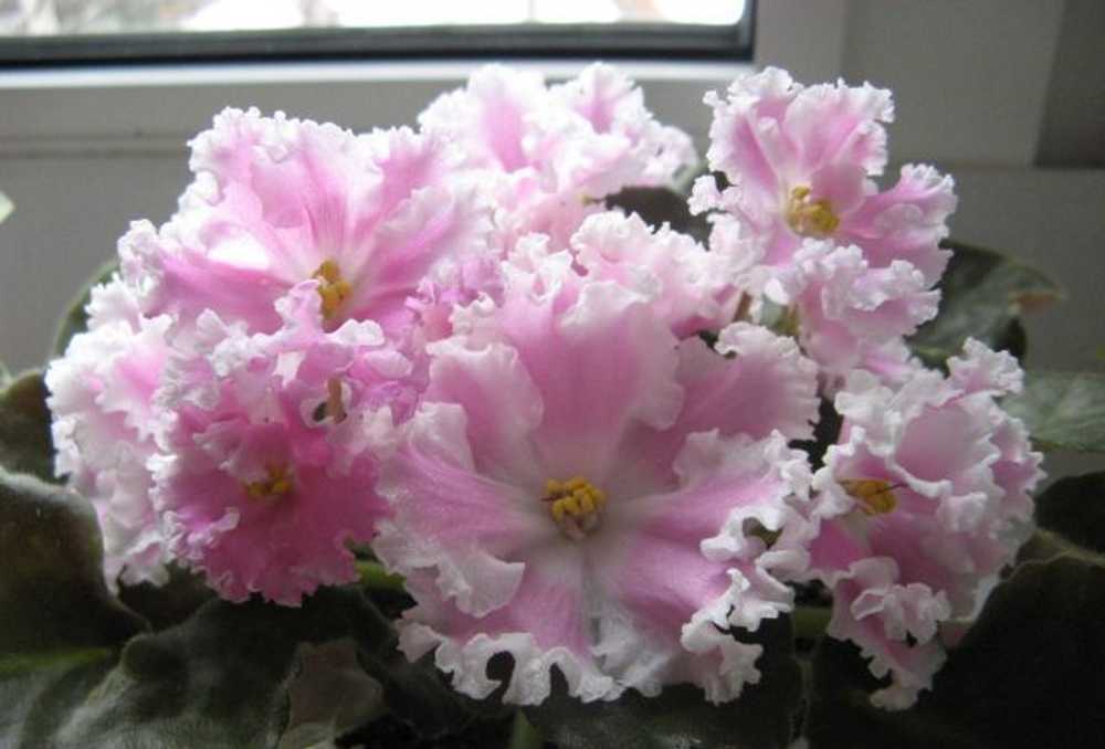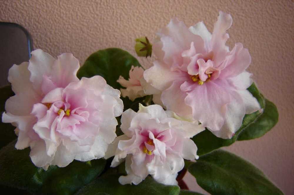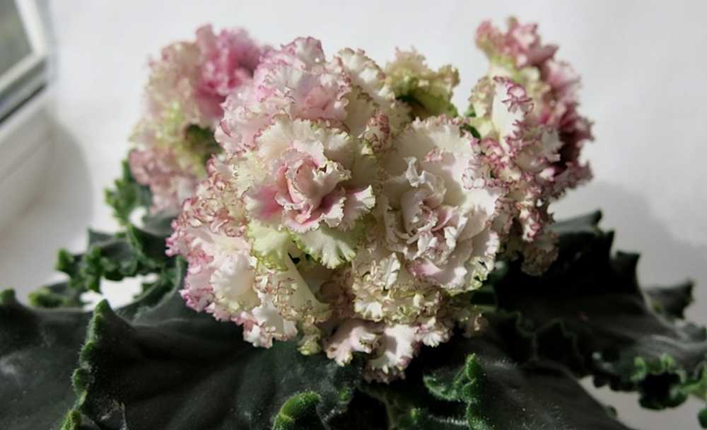 Очень крупные цветы, в первом цветении без всяких усилий выдает цветы по 7-8 сантиметров, иногда вырастают до 9 см. Махровость больше проявляется в следующем цветении, розетке повзрослеть нужно. Есть линии сильномахровые, пышные, а есть полумахровые. Красивое сочетание темных листьев с нежным цветом цветочков.