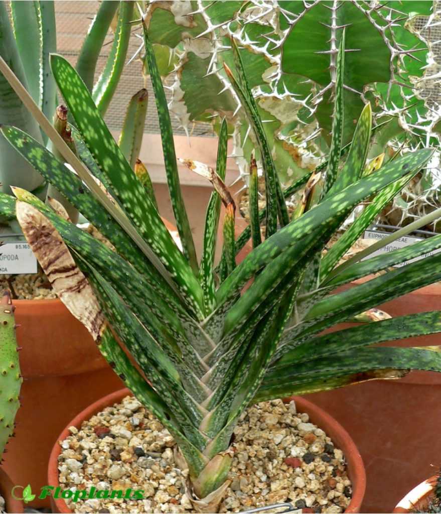 Узкие двадцати сантиметровые листья, шириной 4см, образуют розетку. Каждый лист имеет три грани, изумрудный цвет и светло-зелёные точки, собирающиеся в полосы. Край листа образует хрящевато-зубчатый киль. Цветки имеют розовый цвет.
