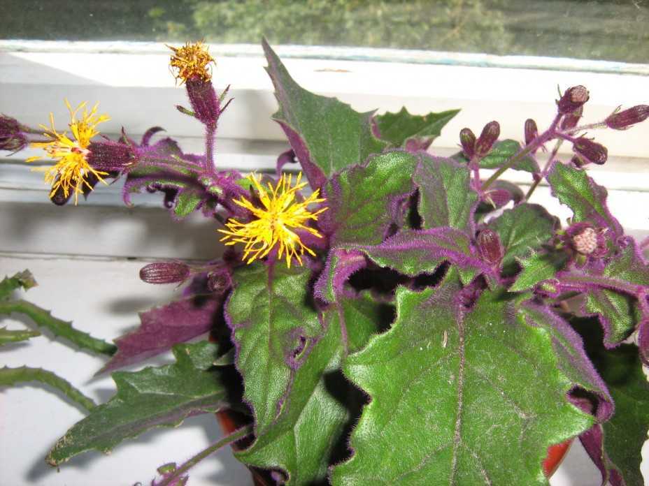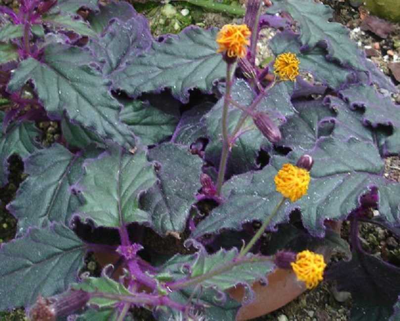 Шикарный полукустаник-многолетник, стебельки ребристые, иногда до 60 см. Листочки меньше, чем у Гинуры Оранжевой, нежные и мягкие, в форме круга, с эффектной пурпурной опушкой. Цветки небольшие по размеру, желтые (оранжевые) с плохим запахом.