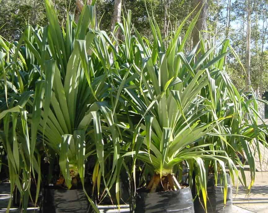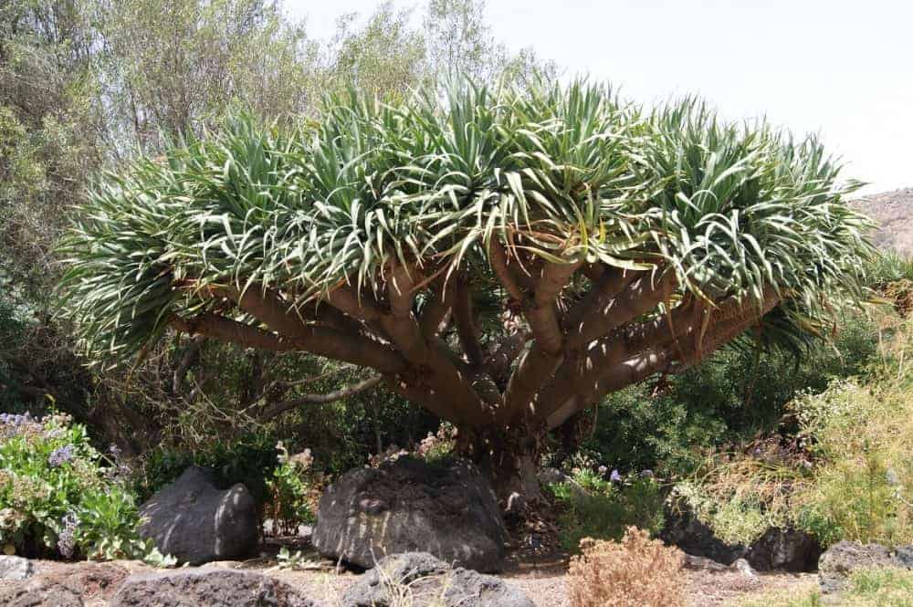 Винтовая пальма Панданус (Pandanus) – к панданам причисляют почти 750 видов древовидных растений семейства Пандановые, обитающих в основном в тропических широтах Восточного полушария. На одном только Мадагаскаре их насчитывают примерно 90 видов. Стволы у них ветвистые и длинные, порой вырастают больше 10-15 м, достигая максимально 25 м. Вдоль деревянистых пагонов образуются придаточные корни, которые спасают растение в момент сильного ураганного ветра. Листовые пластинки могут вырасти до длины 4 м при ширине всего 11–15 см, располагаются спирально на стволе в 2–4 яруса. Соцветия — початки либо метелки.