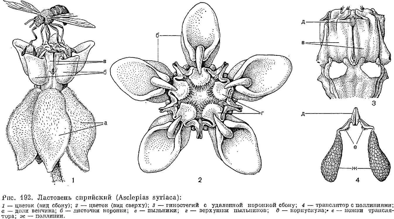 Листья у ластовневых простые, цельнокрайние, супротивно расположенные. Цветки могут быть одиночными, формировать зонтики или пучковидные кисти. Венчик цветка у ваточниковых может быть воронковидным, колесовидным или колокольчатым. Опыляют растения мухи или перепончатокрылые насекомые. Плод – двулистовка с многочисленными семенами.
