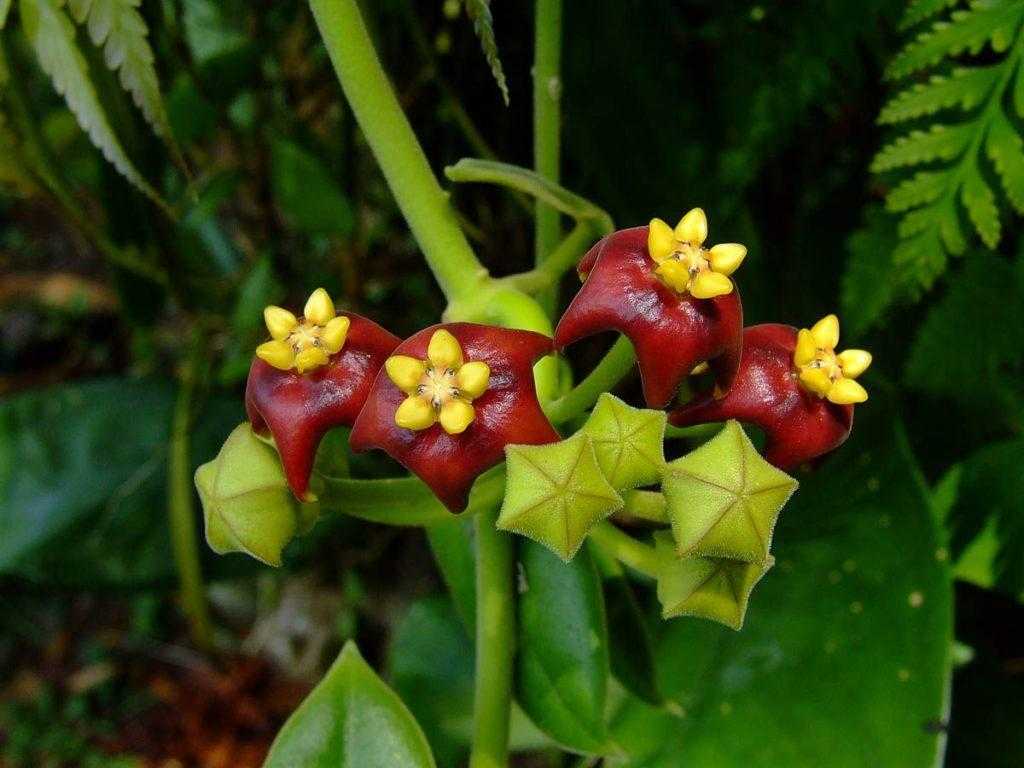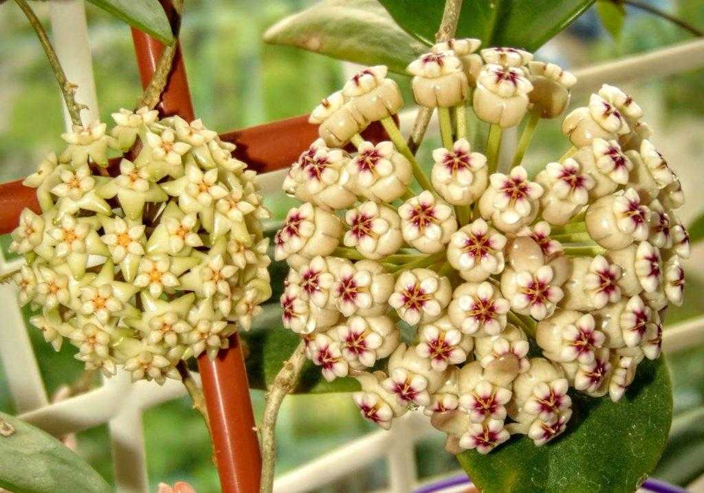 Когда эта лиана дорастает до шести метров, к этому времени ее побеги одревесневают. Растет она только по вертикальным опорам. На стеблях, которые уже позеленели, формируются листочки в форме овала, очень мясистые и окрашены в темно-зеленый цвет. Из листовых пазух выпускаются цветоносы с соцветиями-зонтиками.