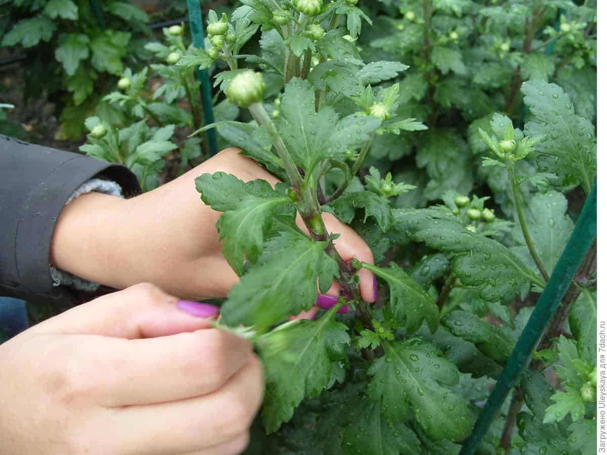 Ухаживать за хризантемой легко. Если вы не прищипнули сеянцы сразу после посадки, сделайте это в стадии формирования у них восьмого настоящего листа. Нужно это для того, чтобы кустовая хризантема стала гуще. Не нуждаются в прищипке только крупноцветковые хризантемы, у которых, наоборот, удаляют все боковые побеги, оставив только несколько самых развитых. Обрезанные побеги можно укоренить.
