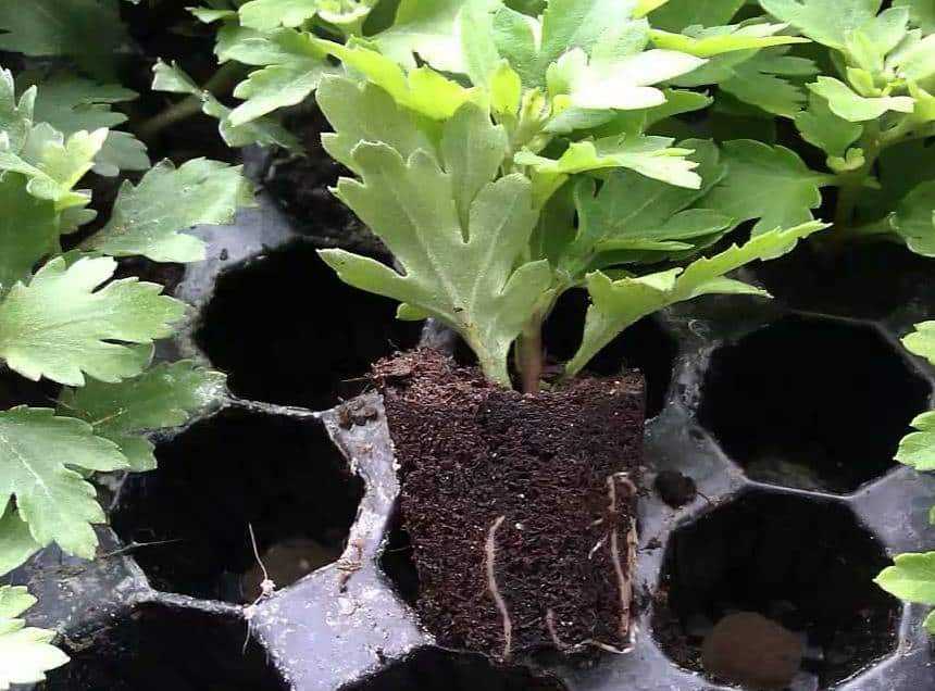 - черенки смачивают водой и вставляют под углом в питательный грунт, который насыпают в маленькие горшочки. Можно укоренять хризантемы и в одной емкости, но тогда черенки придется пикировать, как только они начнут расти и образовывать первые листики;