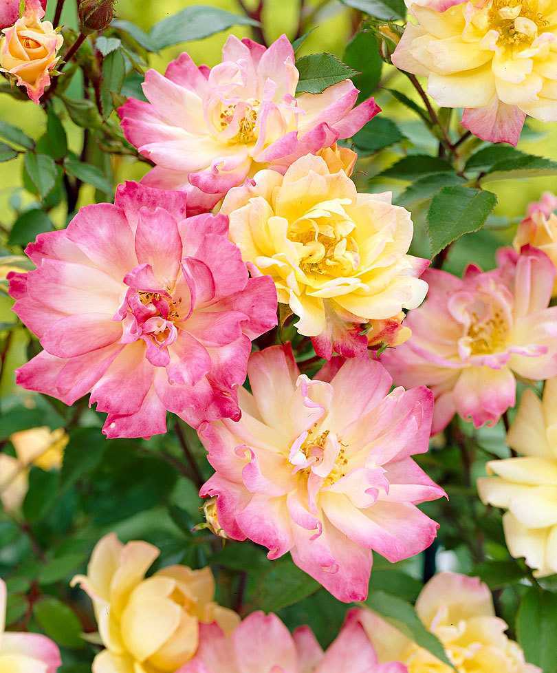 Лепестки роз обладают махровой основой. Поражает многообразие расцветок. Это могут быть бутоны как одного цвета, так и сочетающие два. Есть сорта, у которых окрас меняется в течение сезона. Так, у сорта «маскарад» цвет от ярко желтого постепенно переходит в розовому, а осенью он становится темно-малиновыми.