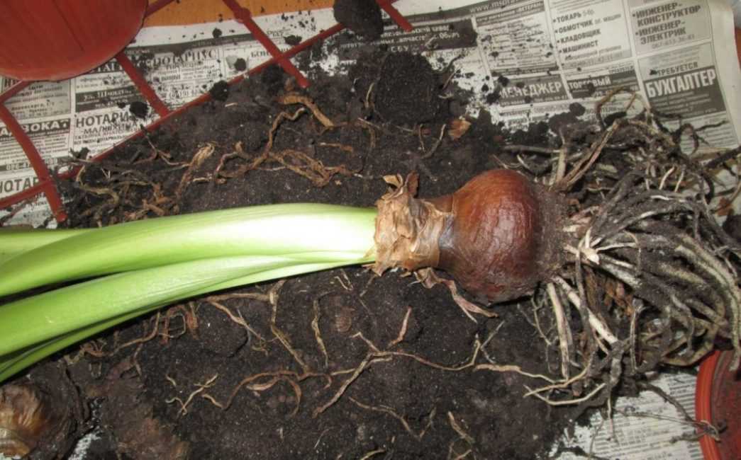 У луковицы обрезают листья, осторожно вынимают их из горшка и аккуратно, чтобы не повредить корневую пятку, промывают корешки от земли, убирают сухую шелуху и просушивают пару недель при комнатной температуре