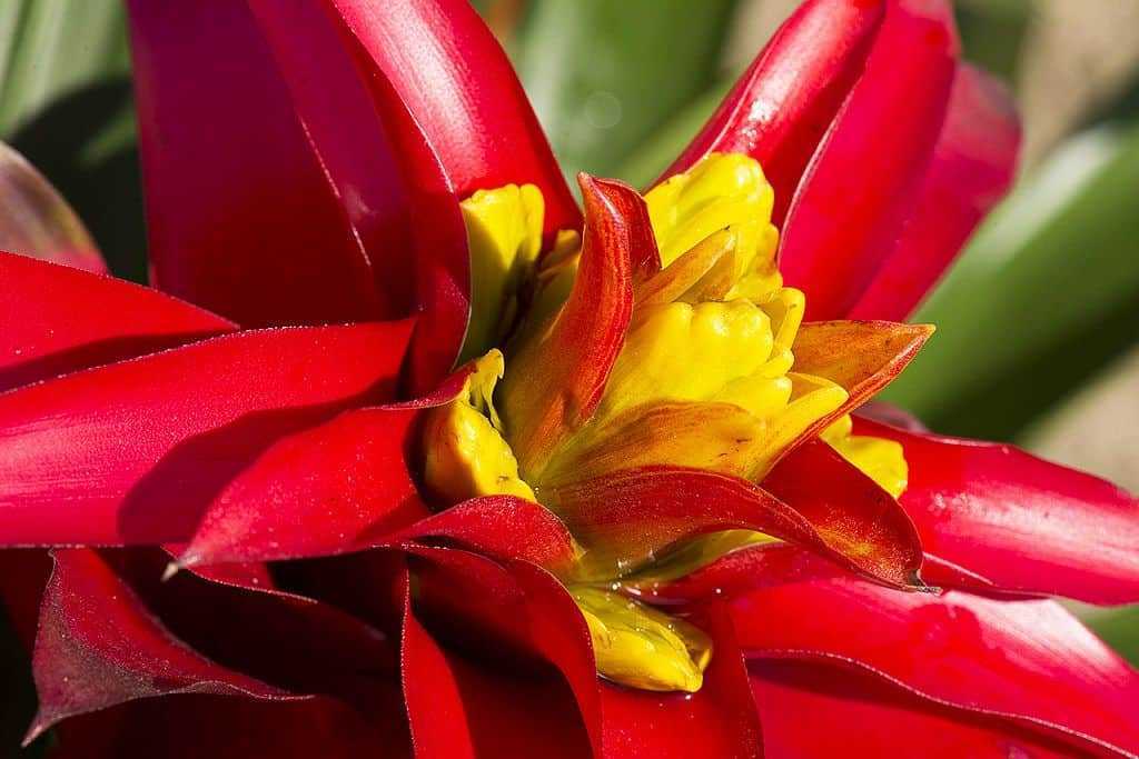 - Кроваво-красная гузмания. Этот вид характеризуется листьями ланцетной формы, которые отгибаются вниз. Из них формируется бокаловидная розетка. Желтый или красный налёт на листовых пластинках делает этот вид высокодекоративным. Листва вырастает до 40 см в длину и до 5 см в ширину. Сама культура в высоту вырастает не более 20 см. Кроваво-красный цветок не имеет цветоносов. В цветовидных соцветиях содержится в среднем по 12 желтых цветочков на цветоножке, которая расположена непосредственно в листовой розетке. Цветение этого растения начинается с приходом весны.