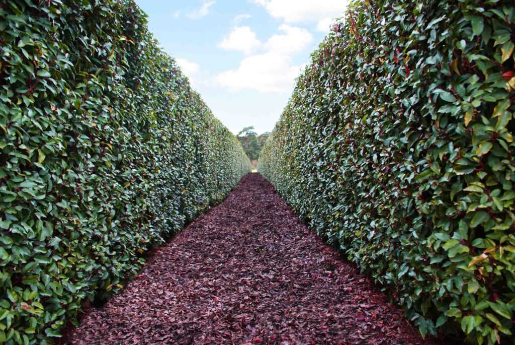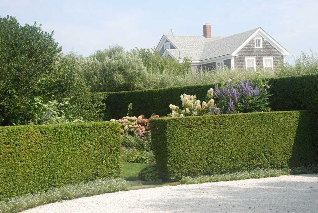 Специалисты советуют сохранять и поддерживать трапециевидную форму кустарников, чтобы нижние ветви получали достаточно света. Самшит, тис и другие растения, способные активно произрастать в тени, можно подрезать прямоугольной формой.