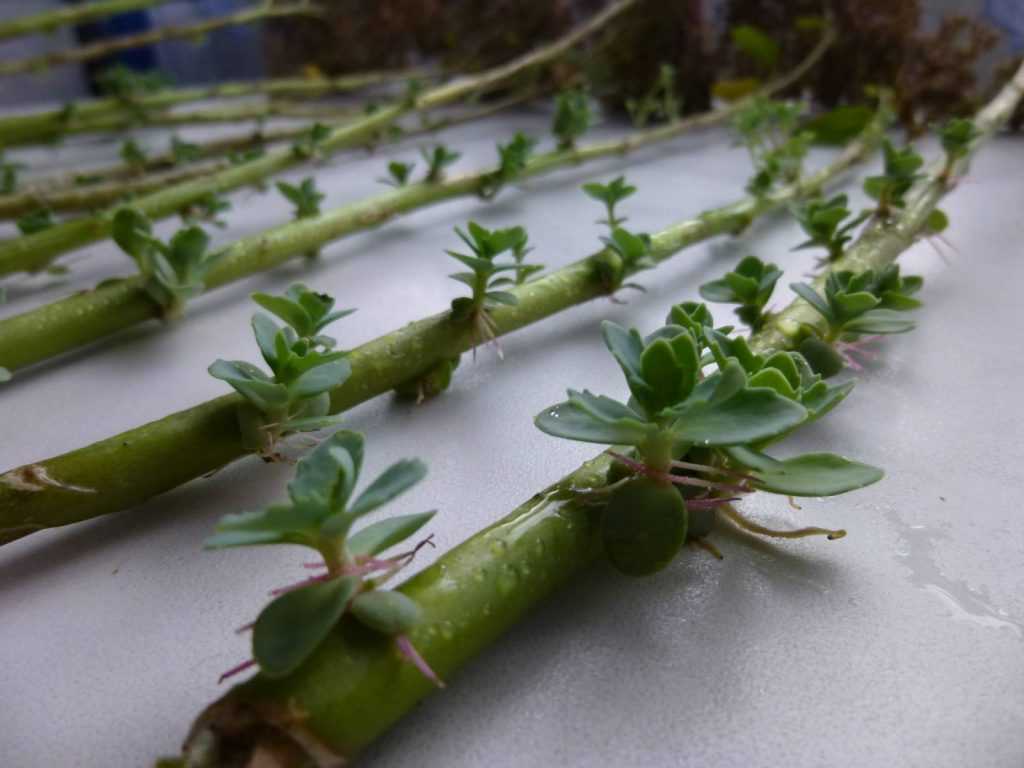 Наилучшее время для вегетативного размножения растения – это весна, с марта по июнь. Его лучше проводить при повышенной до 22-25 градусов температуре. Для этого нужно срезать острым ножом верхушку побега для получения черенков. Стебель делят на части таким образом, чтобы каждый из отрезков имел один лист или спящую почку.
