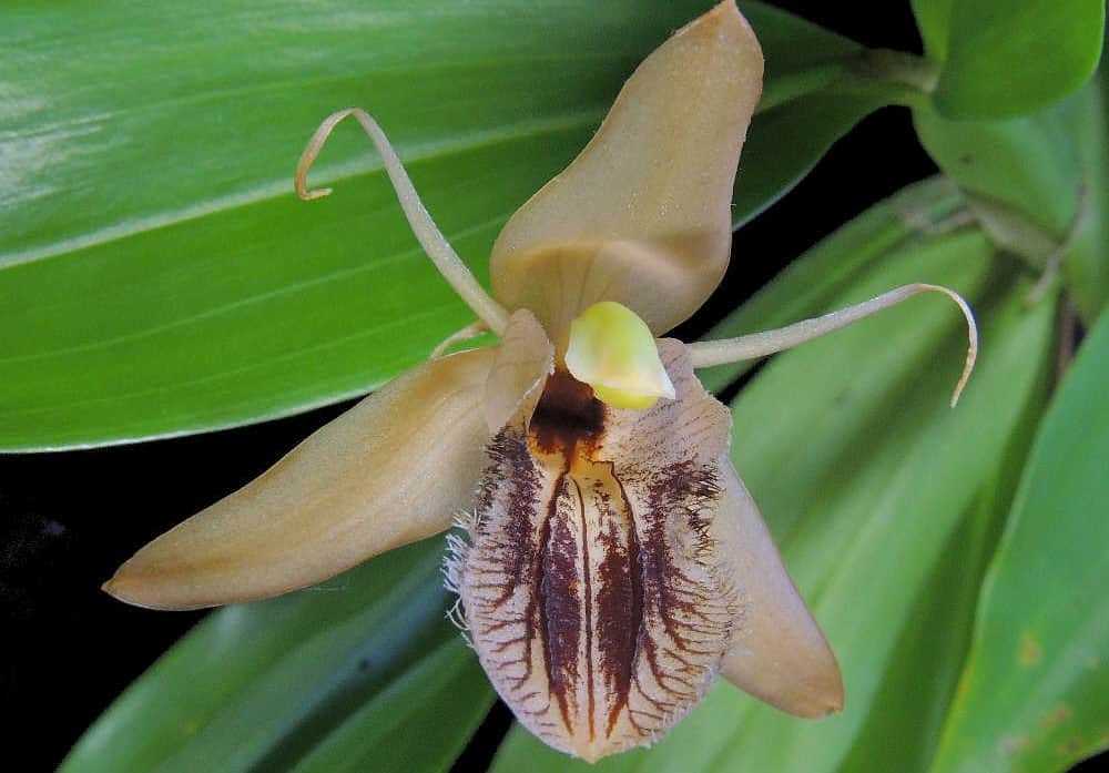 Цветки желтовато-зеленые, диаметром около 6 см, с большой и широкой губой, на которой располагается желтое пятно с красно-коричневыми отводами. Цветет практически круглый год с осенним пиком.