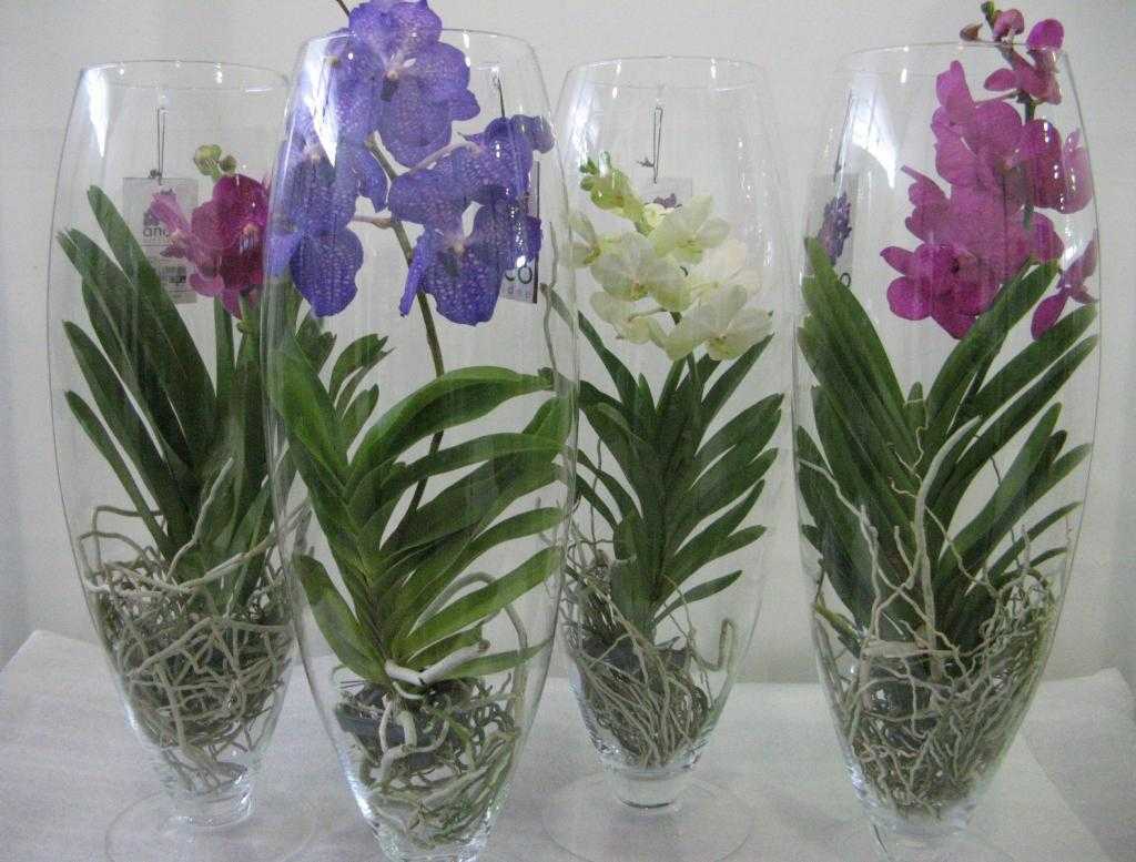 Сегодня все чаще можно увидеть содержание ванды в стеклянных вазах. В вазе ванда обязательно должна крепиться на опору, а корни должны свободно свисать. Дно вазы должно содержать слой влажного песка или керамзита, который будет питать влагой растение. Практически половина корней должна находиться над вазой.