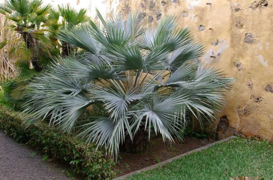 Из вершины растут веерные листья, которые образуют объемную корону. Они держатся на тоненьких черешках с иглами. Окрас у брахеи очень красивый, листовые пластинки нежно-голубоватые, дымчатые. Отличительная особенность этих пальм – жесткость листьев.