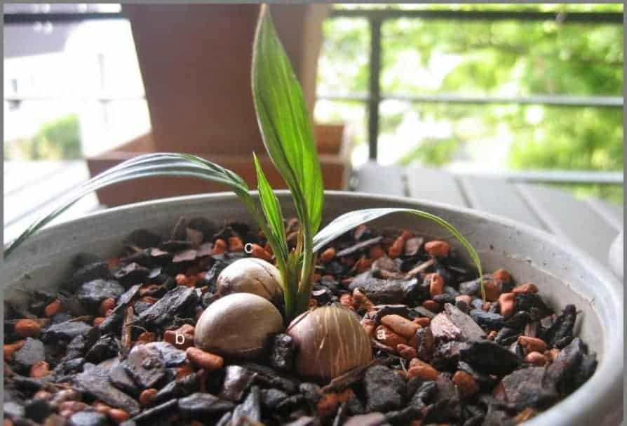 Выращивание кокосовой пальмы из «ореха» отличается тем, что для посадочного материала емкость требуется покрупнее. Плод укладывают на бочок, слегка заглубив в субстрат, так, чтобы зародышевые поры – их три штуки на макушке — находились над уровнем почвосмеси.