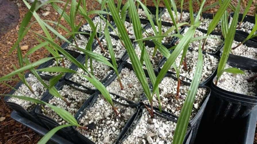 Подготовленные семена заделывают неглубоко в смесь песка и рубленого мха-сфагнума либо в чистый песок. Сверху накрывают посевы полиэтиленовой пленкой и содержат при температуре, соответствующей конкретному виду пальм. Для большинства из них, обитающих в умеренно-теплых регионах, — 20–22 градуса, для растений родом из субтропиков – 28–30 градусов выше нуля.