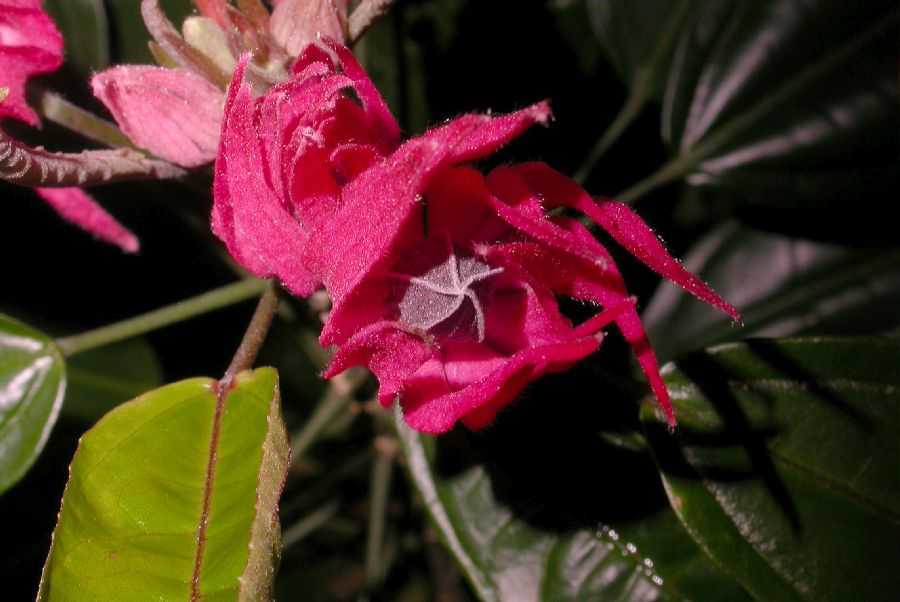 Этот вечнозеленый кустарник зачастую бывает одноствольным. Форма его листочков ланцетно-яйцевидная, при этом края у них сильно-зазубрены. Их длина варьируется от 15 до 20 сантиметров, а ширина ―равна 5 сантиметрам, изнаночная поверхность шероховатая. Пазушные цветочки имеют линейно-язычковые лепестки, которые располагаются в 2 ряда, при этом внутренние несколько длиннее насыщено-красных наружных. Внутренняя поверхность закрытого венчика окрашена в темно-красный, а наружная ― в темно-фиолетовый цвет. Есть также насыщено-красные прицветники.