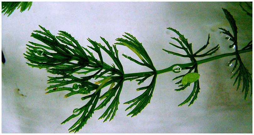 Светло-зеленый роголистник может похвастаться красивыми листочками ярко-зеленого цвета. При их внимательном рассмотрении через лупу вы заметите, что их пухлость обусловлена наполняющими листья воздушными пузырьками.