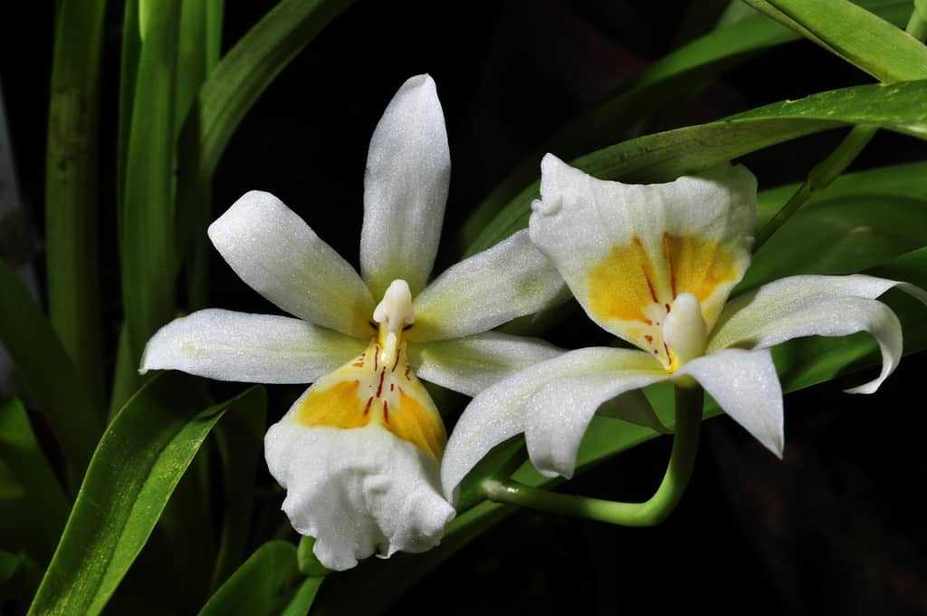 М. фаленопсис (M. phalaenopsis) – цветет с марта по конец ноября крупными белыми цветами с плоским венчиком, на губе светло-пурпурный рисунок из пятен и полосок.