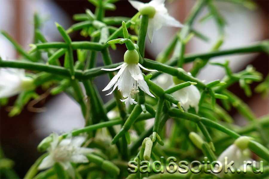 Мезембриантемовидный рипсалис очень похож на компактный еловый кустик, ведь его стебли напоминают голые ветви ели. Побеги имеют круглое сечение. Первичные сегменты могут вырастать около 20 см в длину, а вторичные – не более 1,5 см. Пышные мелкие цветы имеют белый окрас.
