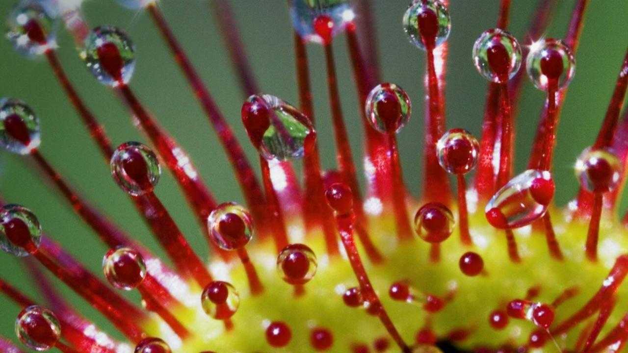 На каждом таком волоске, на самом краю расположилась жидкость, поэтому растение и получило такое интересное название. За счёт росы, которые располагается на тонких волосках, плотоядная росянка охотится на насекомых.