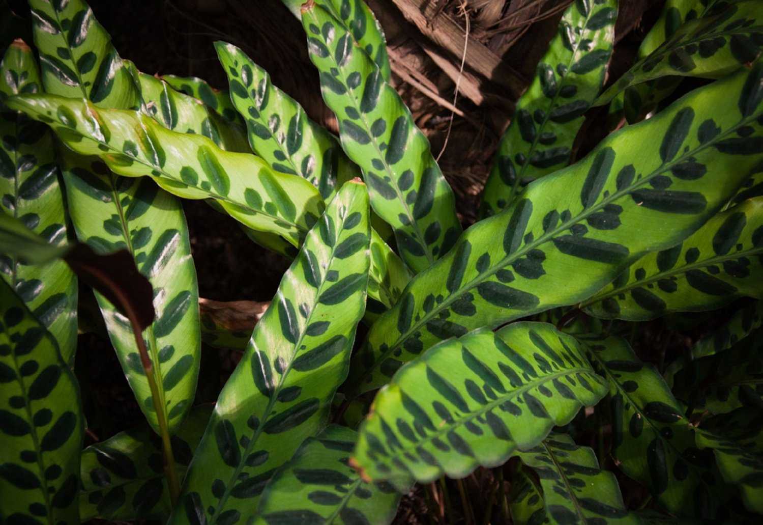 Листья на темно-зеленом фоне имеют темный рисунок. Шириной они до 10 сантиметров, а в длину могут вытягиваться до 30 сантиметров.