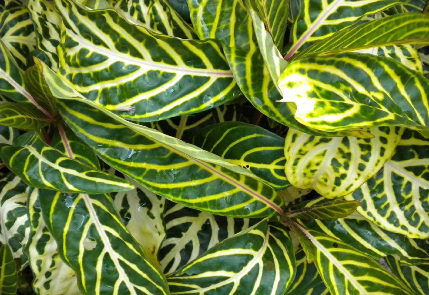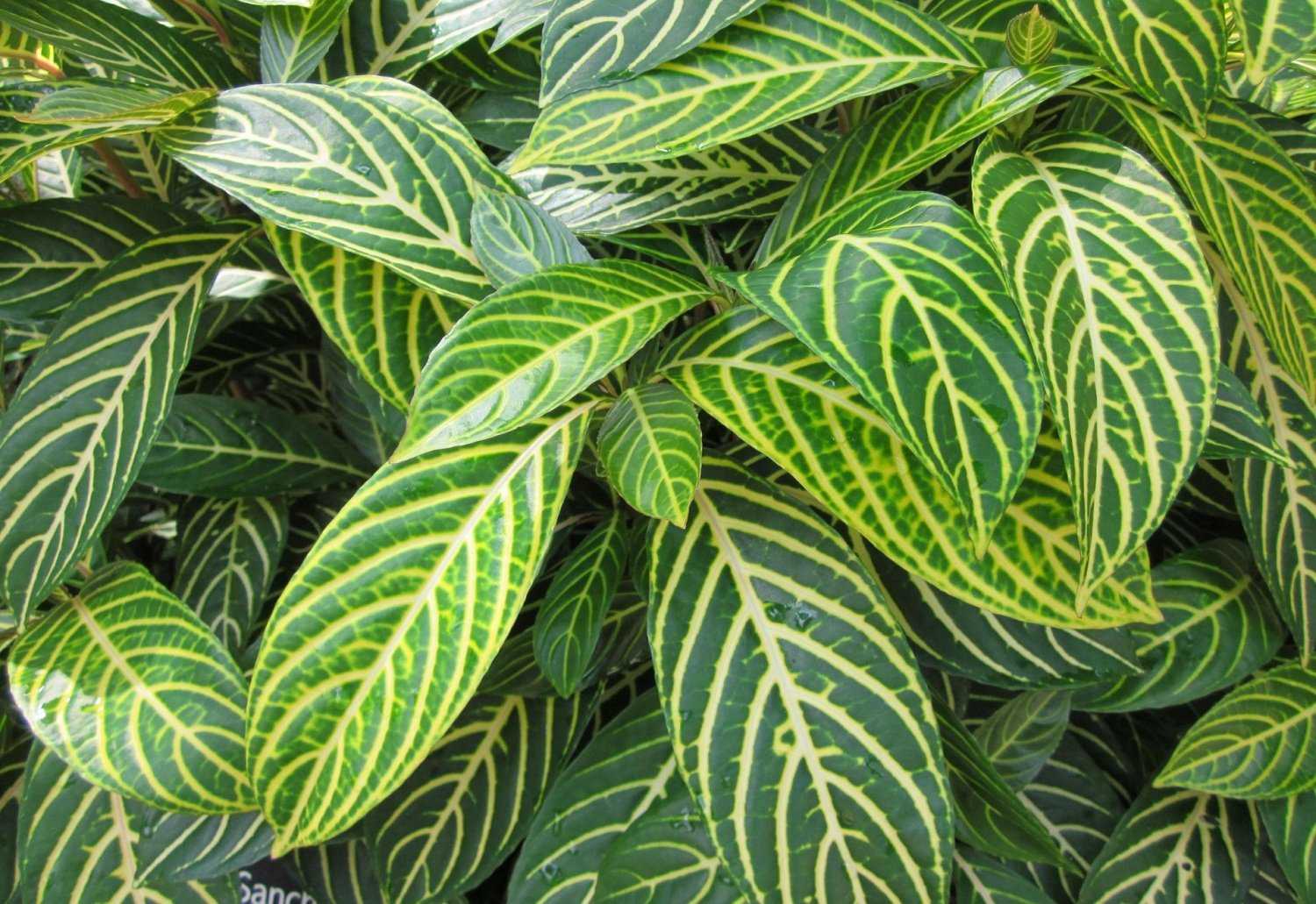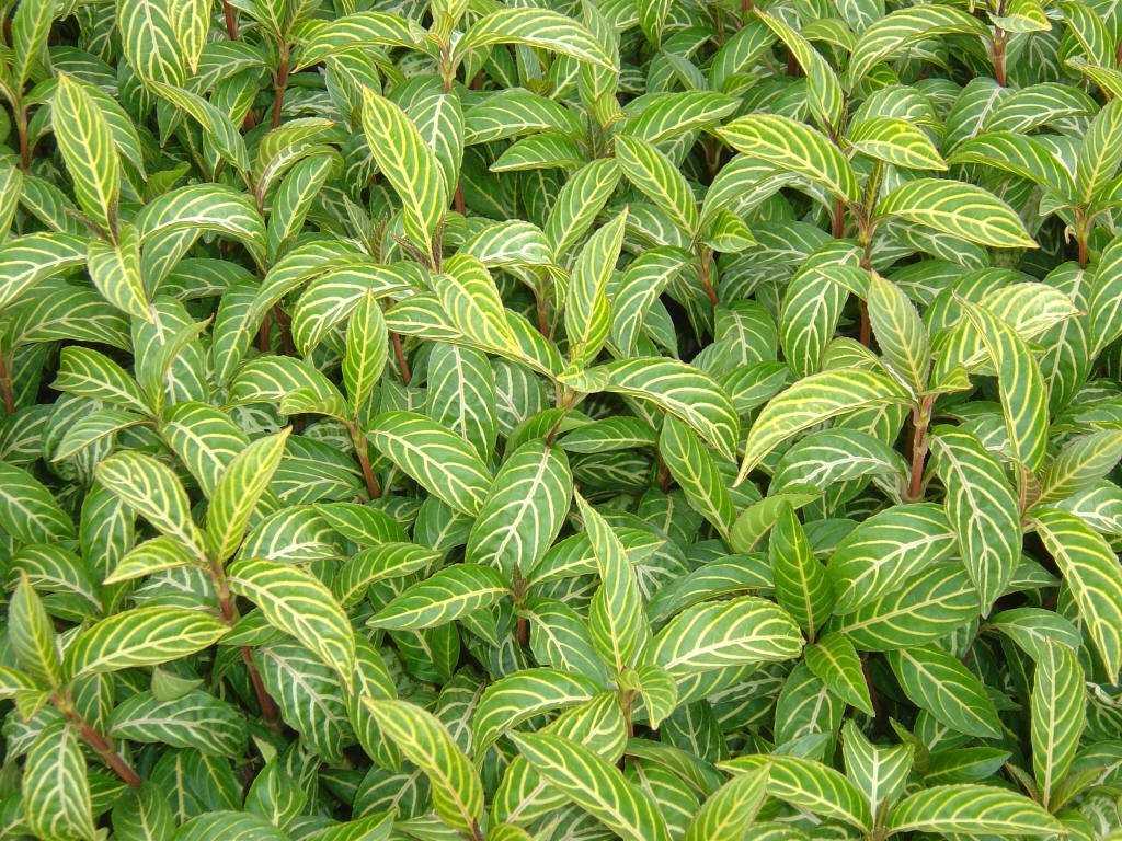 Листья овальной формы заострены к верхушке, имеют супротивное расположение, располагаются на коротких черешках. По краю листовая пластина может быть как ровной, так и покрытой мелкими зубчиками. Центральная жилка и боковые жилки дополнительно подчеркиваются контрастной светло-белой или желтой полоской. В длину листья вырастают до 25 сантиметров.