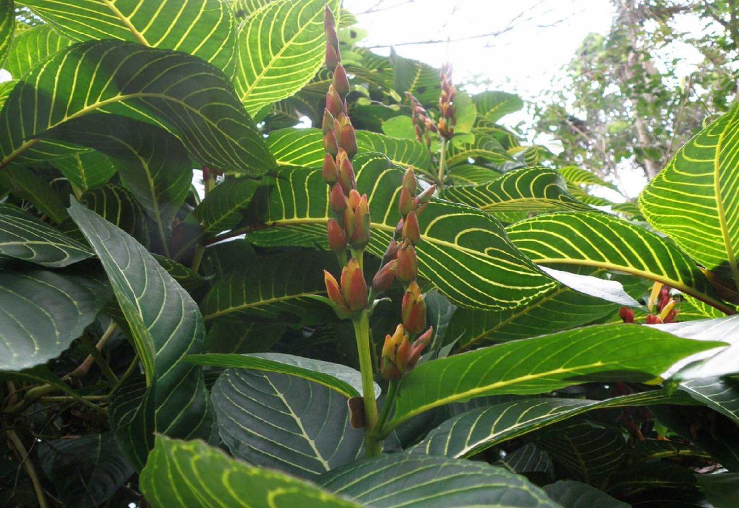 - Санхезия мелкокроющелистная (Sanchezia parvibracteata). Представляет собой более крупный кустарник, чем предыдущие разновидности, который по высоте может достигать почти двух метров, но в культуре его параметры изменяются в диапазоне 80-90 см. Обитает растение во влажных лесах Южной Америки, где господствует тропический климат. Стебель этого многолетника отливает красноватым оттенком. Листовые пластины обладают широкоэллиптическими очертаниями, с закругленной верхушкой. Средняя жилка листа и, те, которые расположены по бокам, также отливает красноватым или розоватым колером. При цветении соцветие принимает головчатую форму и его образуют цветочки оранжевого или красноватого тона. Величина соцветия несколько мельче, чем у санхеции благородной — её размер составляет 30 см. Величина прицветников также не отличается крупными параметрами.
