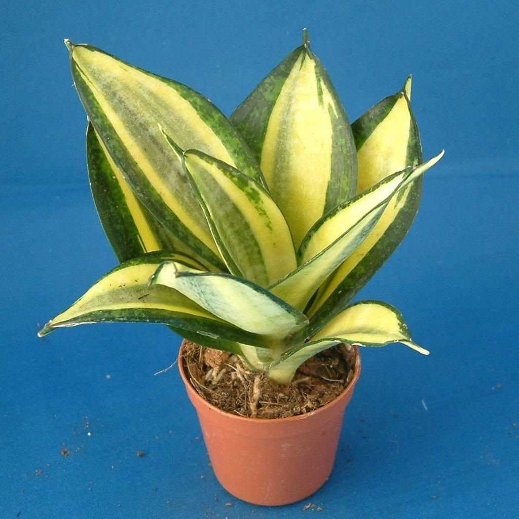 Принадлежит к новым сортам, отличатся от сорта Сансевиерия Лауренти короткими и широкими листьями. Желтая полоска по краю листьев узкая.
