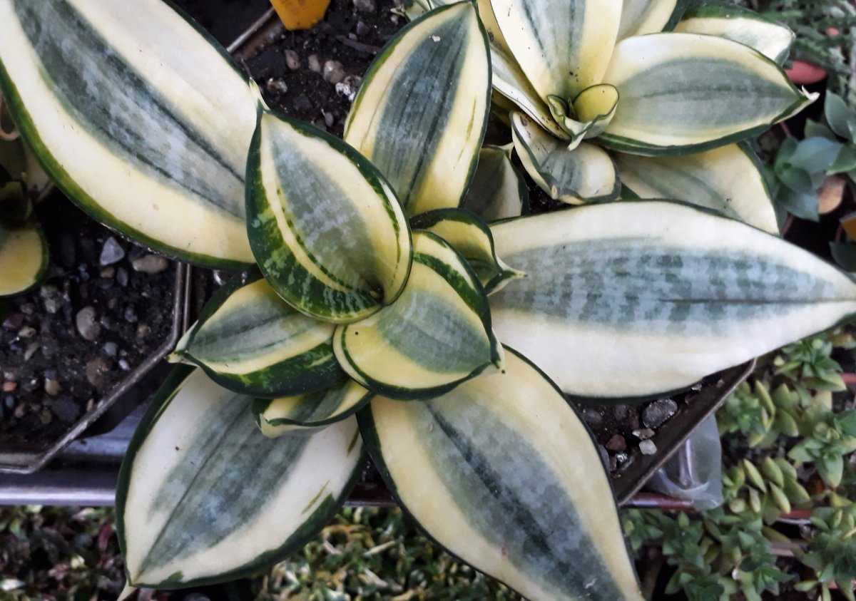 Сорт Lucile Polan – красивый трехполосый сорт сансевиерии Ханна с серебряной полосой по краям и светло-желтыми полосами по бокам, подчеркнутыми темно-зеленой каймой. Он кажется очень акварельным и нежным. Листья в розетках постепенно ложатся почти горизонтально.
