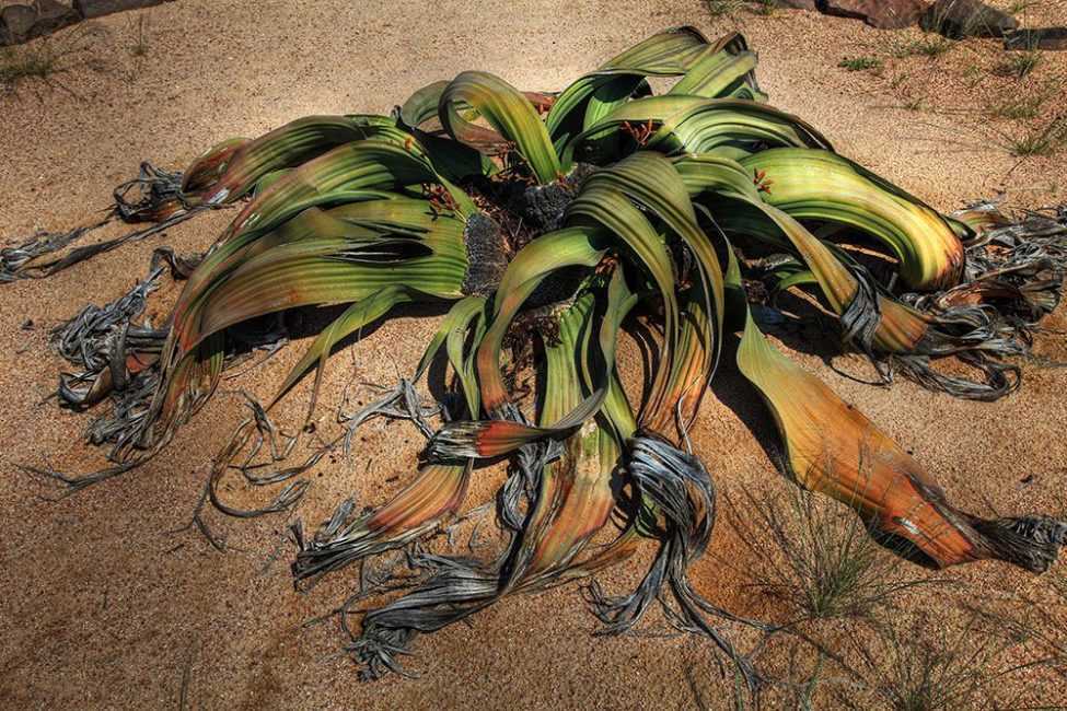 Это реликтовое растение обитает в самой древней пустыне нашей планеты – Намиб, которая расположена на юго-западе Африканского континента. Глядя на сухую груду листьев с отмершими краями, не сразу можно понять, что это – живое растение, причем живет оно очень долго: возраст некоторых экземпляров достигает 2000 лет.