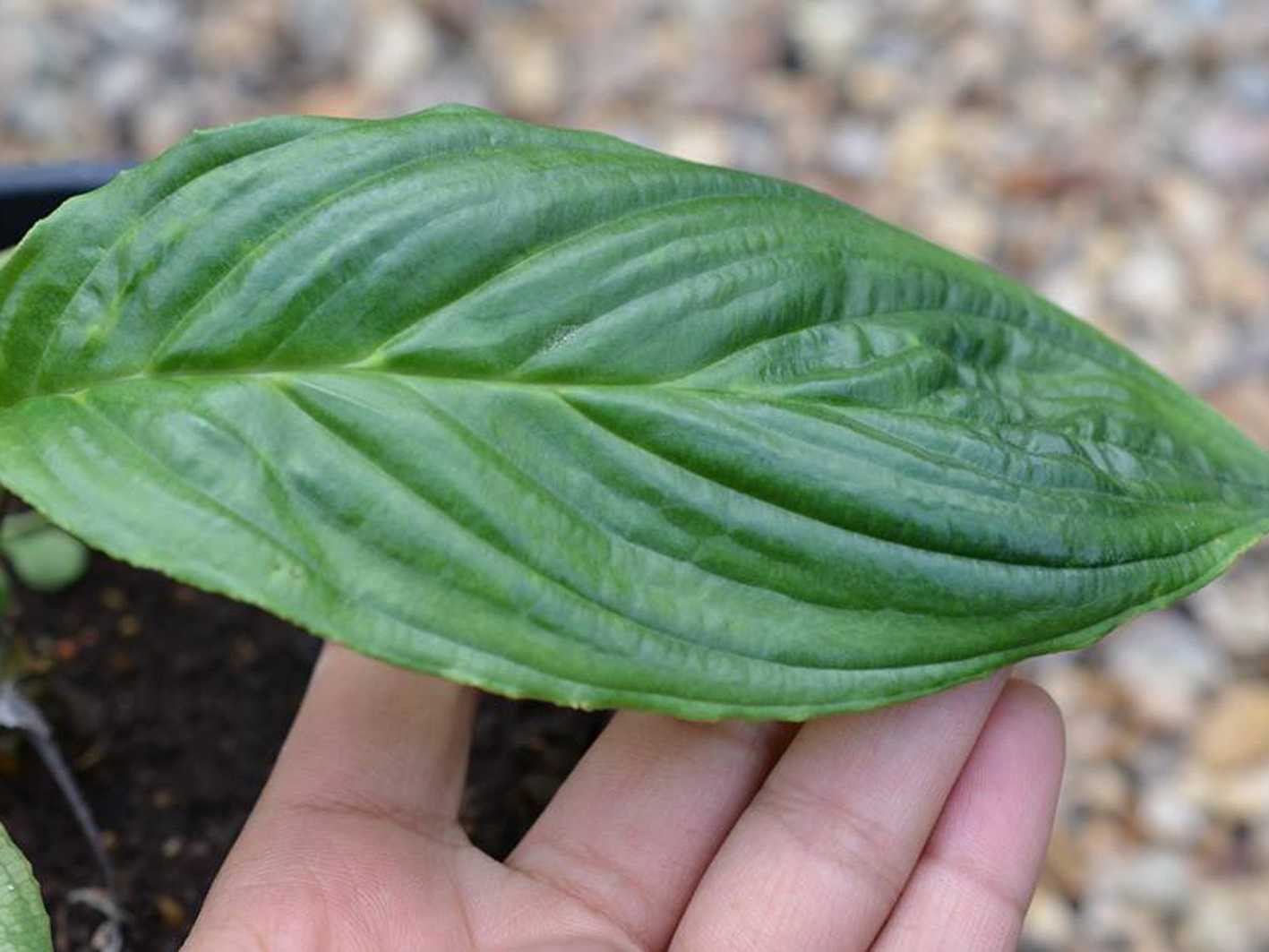 Родиной данного вечнозеленого растения является Индия. Такой вид отличается от остальных своими довольно широкими листочками с зеркально-гладкой поверхностью. В ширину они могут достигать 35 сантиметров, а в длину ― 70 сантиметров. Цветки накрыты парой белых достаточно больших двадцатисантиметровых покрывал. Сами цветочки могут быть окрашены в темно-фиолетовый, черный либо пурпурный цвет. Прицветники у данного растения очень тонкие, шнуровидные и в длину могут достигать 60 сантиметров. Образуется плоды, представленные в виде ягод.