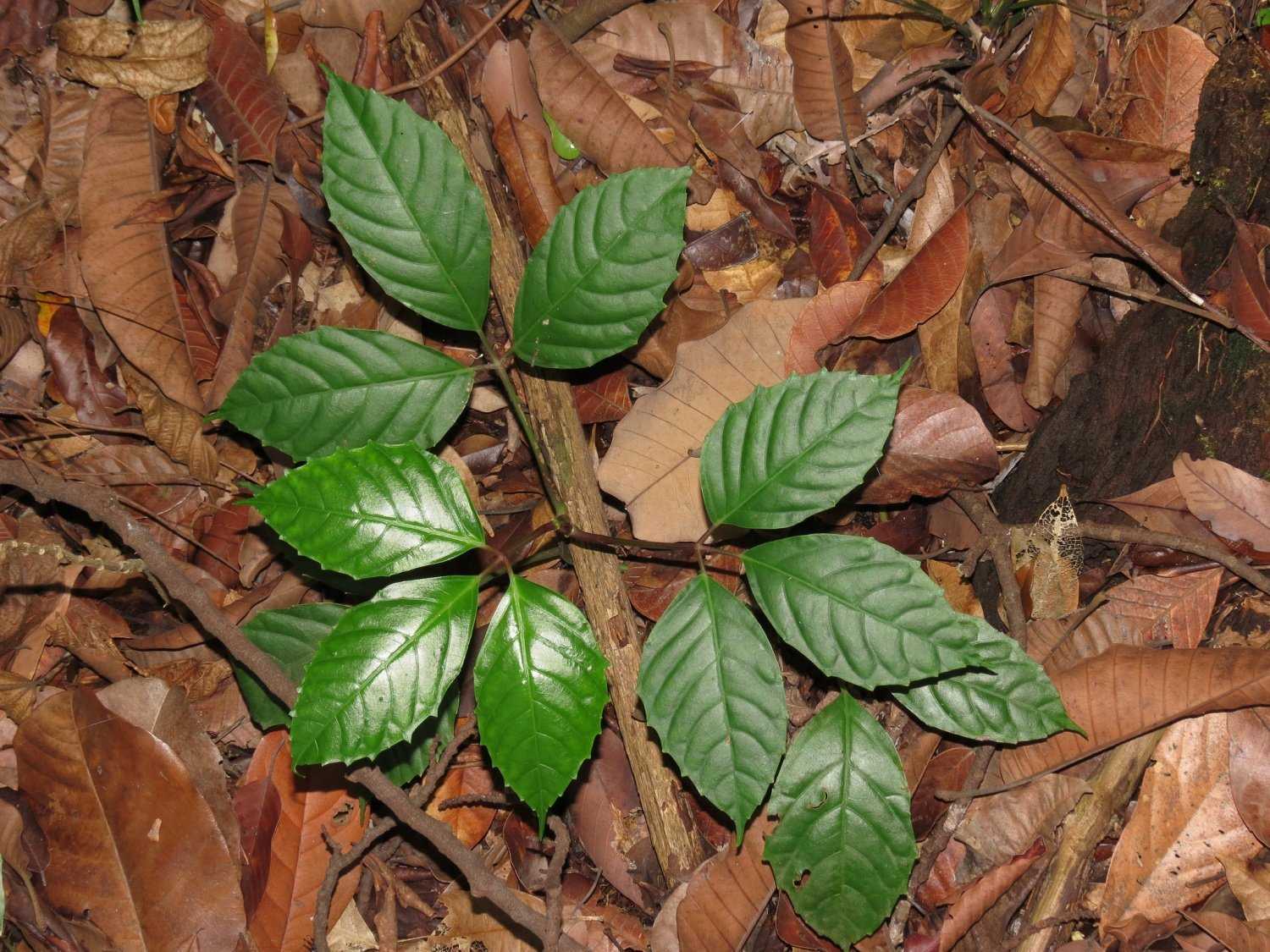 Молодые побеги покрыты очередными листьями на черешках длиной 5 см. Диаметр одного листа может достигать 35 см. Каждый лист состоит из 3-7 долей. У этих долей имеется собственный, более короткий черешок. Доли продолговатой формы имеют зубчатые бока и заостренный конец. На кожистой темно-зеленой листовой пластине располагаются плотные, выступающие жилки. На оборотной стороне листа можно увидеть короткие красновато-коричневые ворсинки. Из множества крохотных желез снизу листа постоянно выделяется и кристаллизуется сок растения.