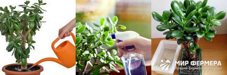 Полив имеет свои особенности: крайне нежелательно, чтобы почва была слишком влажной, в противном случае у растения могут возникнуть грибковые заболевания или же земля попросту начнет загнивать. Если листья толстянки пожелтели, стали вялыми и мягкими – осмотрите корни, возможно, началось гниение.