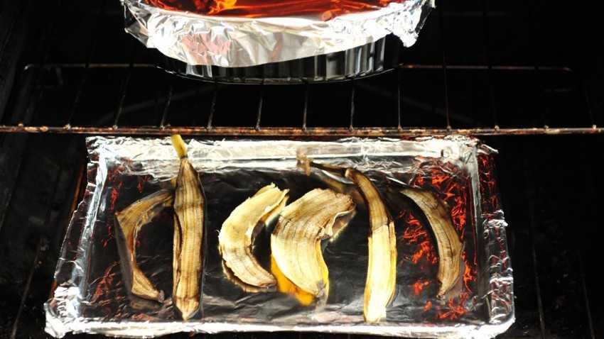 Для начала следует разложить поделенную на ломтики банановую кожуру, разместив ее внешней стороной вниз, на застеленный фольгой противень или лоток.