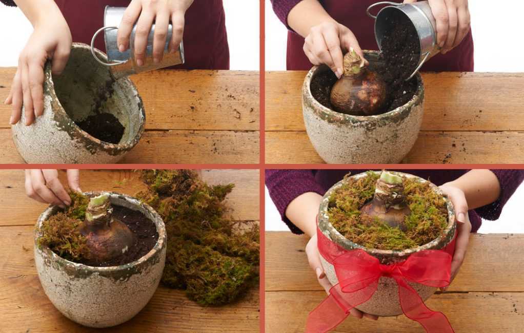 - Затем луковицу пересаживают в новый горшок большего размера, на дно укладывают дренаж