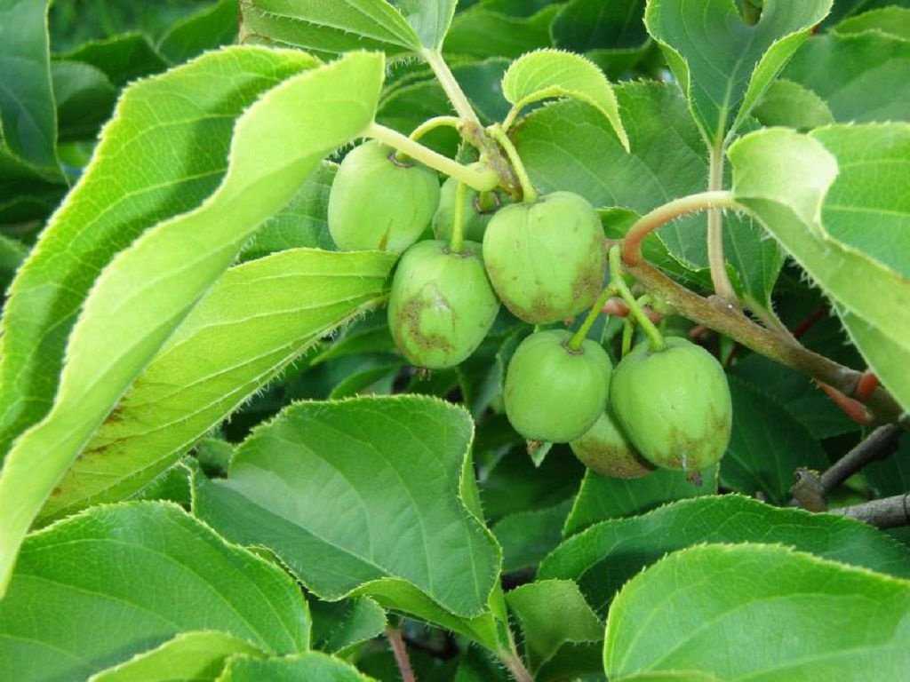 Актинидия деликатесная. Вьющаяся разветвленная лиана длиной до 9 м покрыта яйцевидными черешковыми листьями 7-13 см в длину. На молодых листочках присутствует красноватый ворс. Растение однодомное, на нем распускаются обоеполые душистые цветы. Бутоны растут по 1-3 штуки в пазухах листьев. Продолговатые плоды диаметром 5-6 см покрыты ворсистой коричневой кожицей. Под ней скрывается кисло-сладкая зеленоватая мякоть с мелкими черными семенами.