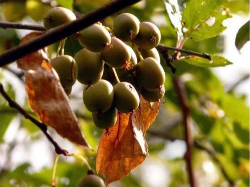 Актинидия полигамная. Гибкая лиана высотой 4-5 м покрыта овальными листьями с заостренным краем. Растение распускает белые мелкие цветы, а позже дает съедобные кисло-сладкие плоды массой около 3 г.