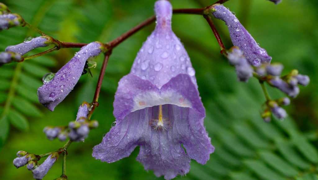 Как видно на фото мимозолистной жакаранды, венчик растения контрастно суживается в тонкую трубку у основания: