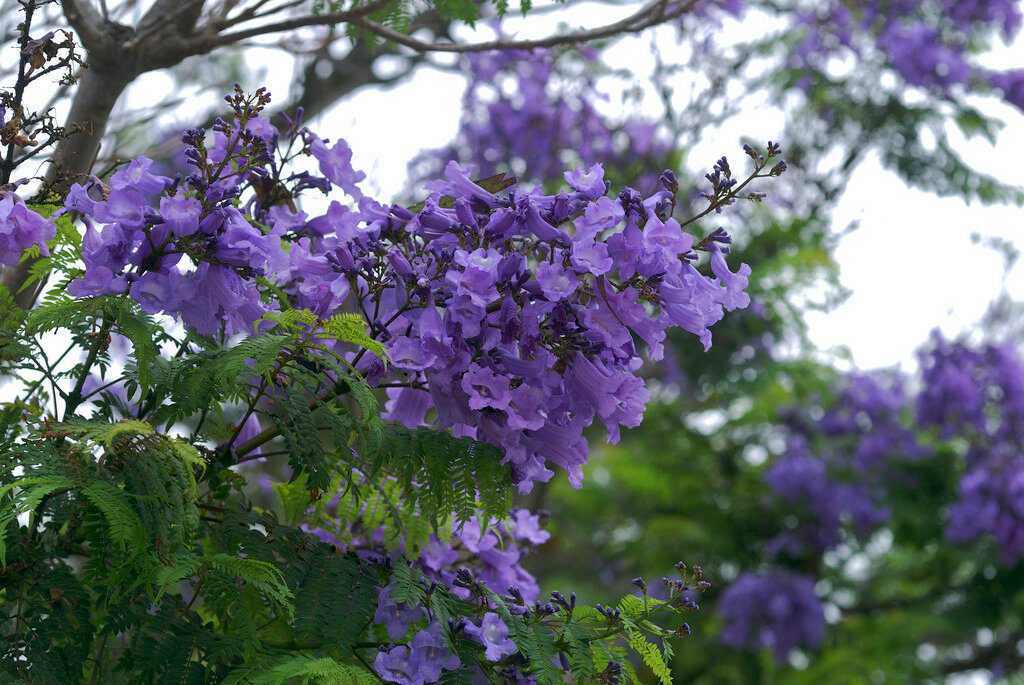 Цветущая Жакаранда – это восхитительно красиво.Светло-фиолетовый цвет, белые крапинки. Несколько напоминают колокольчики.