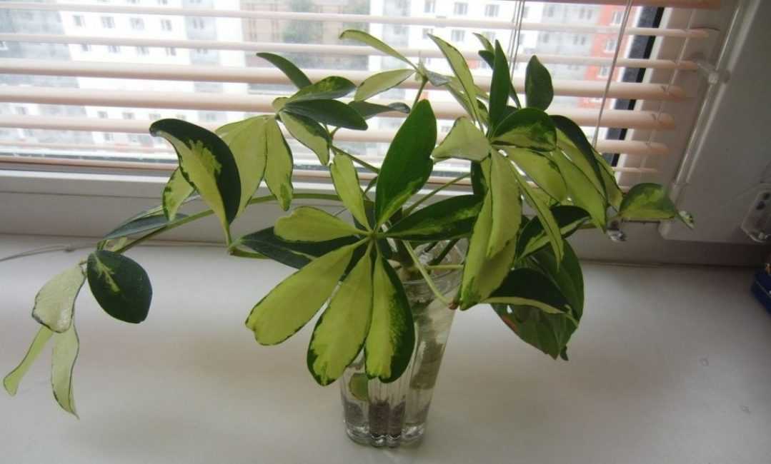 Существует 2 способа укоренения: с помощью воды или субстрата. Чтобы укоренить шефлеру в воде, следует примерно через месяц (для пестрой это нужно сделать позже) высадить черенки в грунт и накрыть их пакетом, предварительно проделав в нем отверстия для вентиляции (можно заменить стеклянной банкой). Ежедневно нужно снимать пакет на полчаса, чтобы растение имело доступ к свежему воздуху.